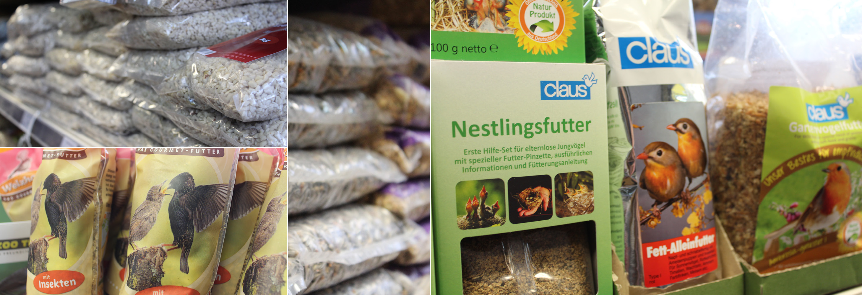Nestlingsfutter · Fettfutter · Streufutter · Sonnenblumenkerne · Erdnüsse · Müsli · Knödel und verschiedenes an Leckereien, sowie Eichhörnchenfutter und Igelfutter für die wildlebenden Säuger