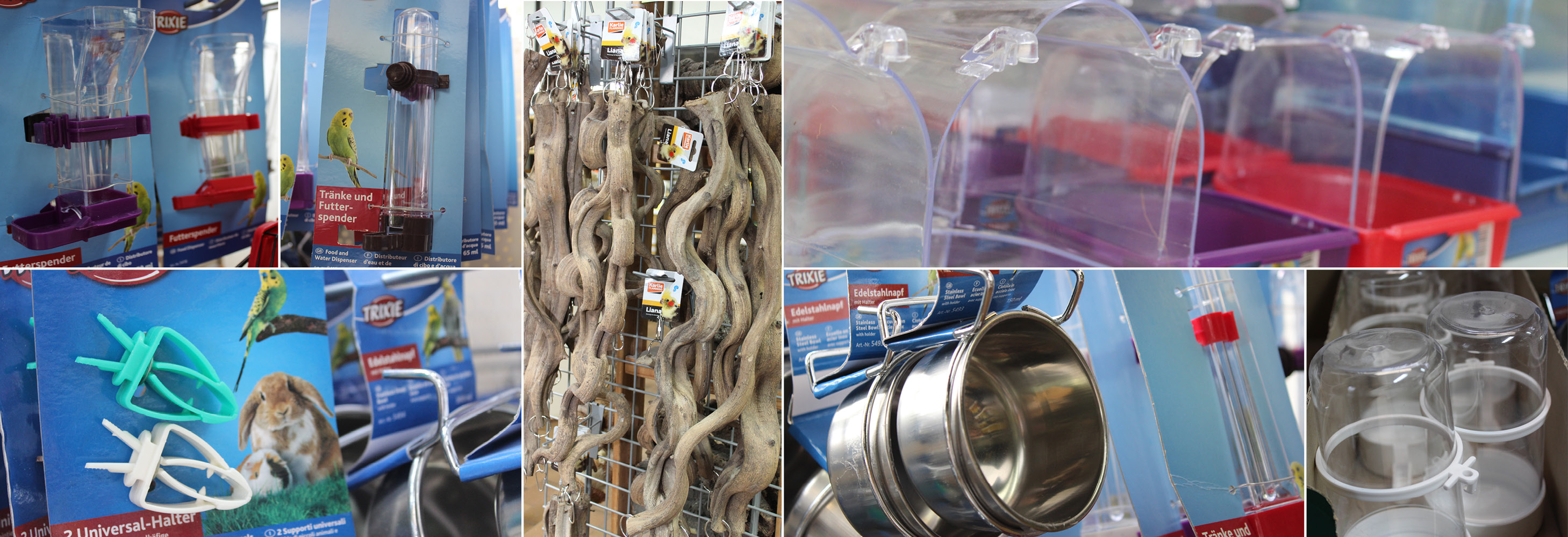 Wir präsentieren Ihnen ein großes Zubehörsortiment mit Näpfen, Naturholzsitzstangen, Badewannen, Nistkästen, Vogelsand und allem was dazugehört.