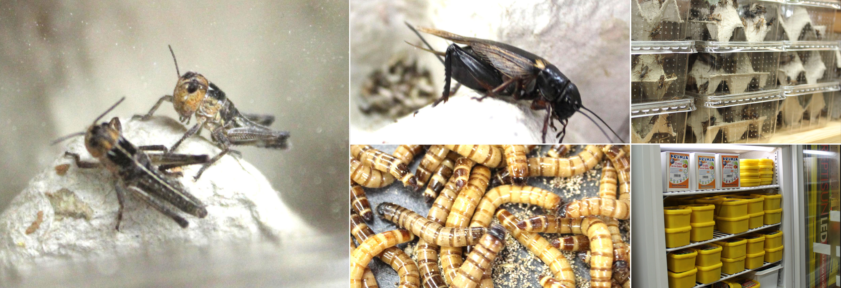 Heimchen · Grillen · Heuschrecken · Mehlwürmer · Zophobas · Wachsmottenlarven · Regenwürmer · Rosenkäferlarven · Fruchtfliegen · Schimmelkäferlarven · Argentinische Schaben · Stummelflügelfliegen · Mäuse · Ratten (nur auf Vorbestellung)